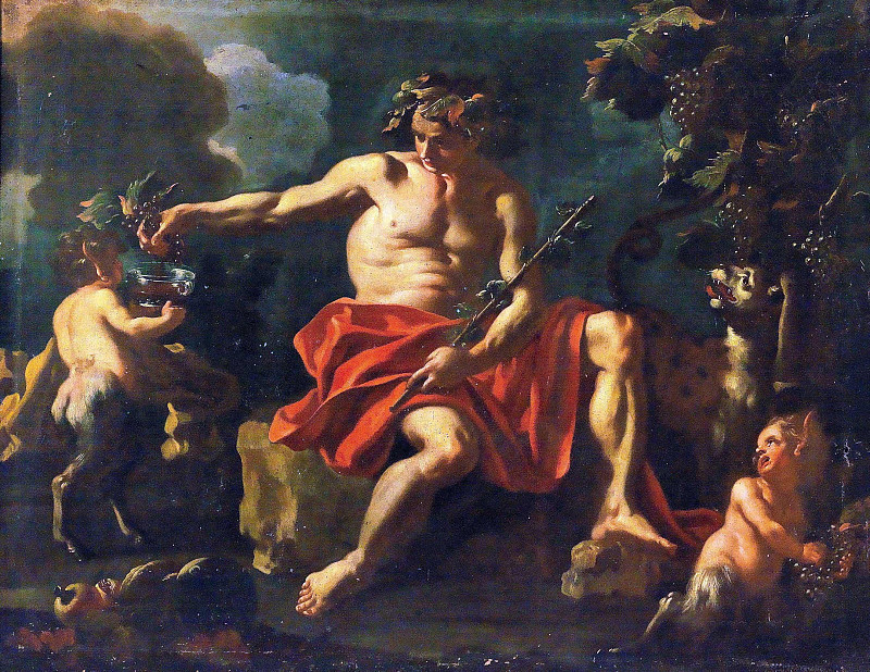 Le fond, volontairement sombre, est animé par une végétation luxuriante, notamment des branches de vigne chargées de raisins mûrs, renforçant lassociation avec la fertilité et labondance. Sur les côtés, deux figures ailées, probablement des satyres ou des faunes, ajoutent une dimension de fête et de plaisir sensuel. Lun deux porte un instrument de musique, un tambour, suggérant une célébration, tandis que lautre semble offrir une corbeille.