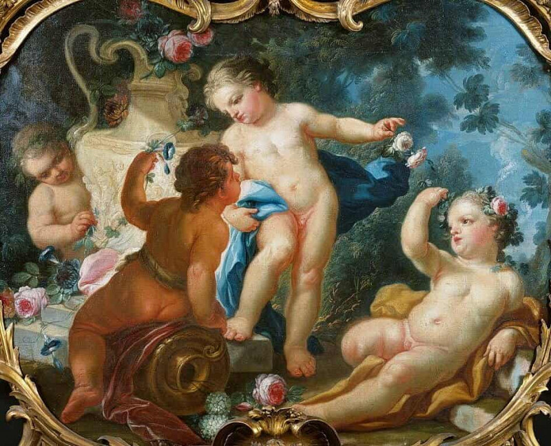 Le premier putto, assis à gauche, manipule une fleur, concentré sur son action. À ses côtés, un autre putto, en position plus basse, semble lui offrir une autre fleur, créant une interaction simple mais pleine de tendresse. Au centre, un putto plus grand, debout sur un dais, attire l’attention par sa posture dynamique. Il tient une étoffe bleue, qu’il utilise peut-être pour dissimuler partiellement sa nudité, un geste qui ajoute une touche de coquetterie à la scène. Son regard, dirigé vers le spectateur, instaure un lien direct et engageant.