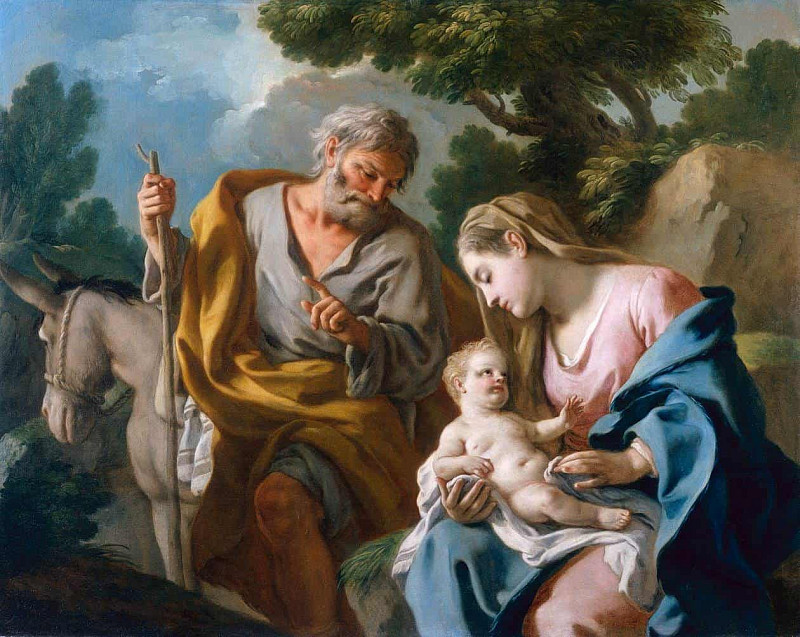 Larrière-plan, subtilement flouté, offre un paysage bucolique. On distingue des arbres luxuriants, un ciel nuageux et une colline verdoyante, suggérant un refuge paisible, un moment de répit au milieu dune fuite. Un âne, à gauche, se tient paisiblement, symbole de modestie et de voyage. Sa présence renforce limpression dun déplacement forcé, bien que latmosphère générale soit empreinte de calme.