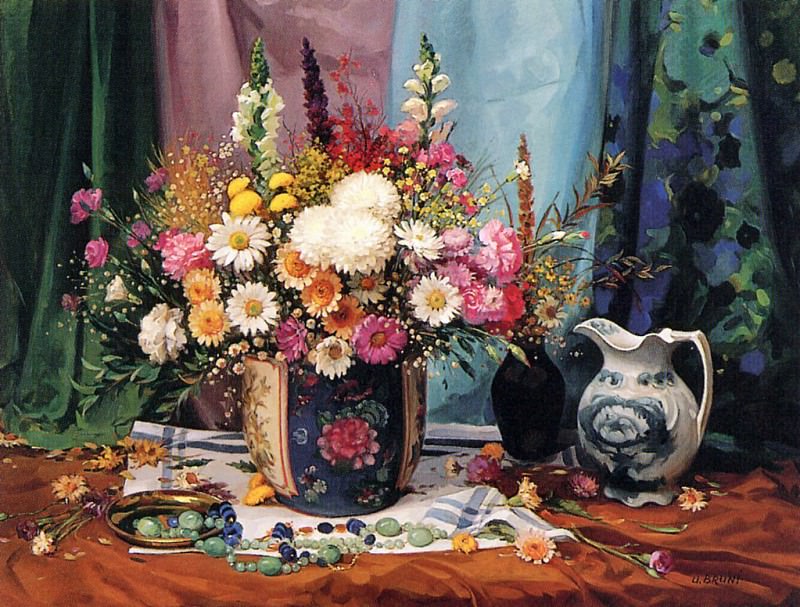C'est peut-être peinture représentant des fleurs roses et blanches dans un vase sur une nappe bleue à côté d’une boîte à bijoux et d’un collier.