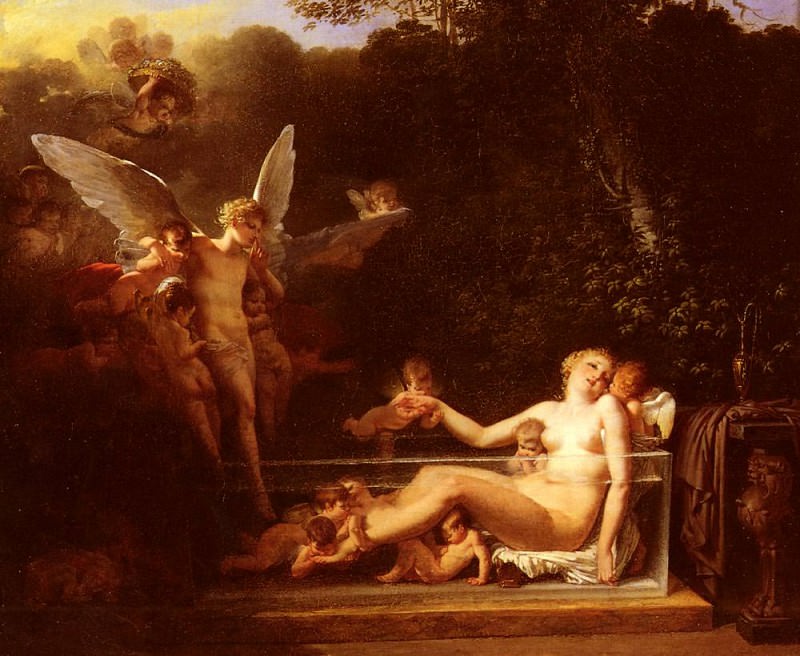 C'est peut-être peinture représentant une femme en robe blanche debout devant une porte, avec un chien de l’autre côté de la porte et un chien au premier plan..