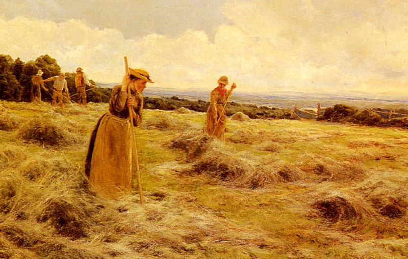Larrière-plan est composé dune étendue de terres agricoles, parsemée darbres et de quelques bâtiments agricoles, indiquant la présence dune ferme ou dun village à proximité. Un groupe de personnes est visible au loin, travaillant dans les champs, ce qui met en perspective lactivité agricole comme un élément central de la vie de la communauté.