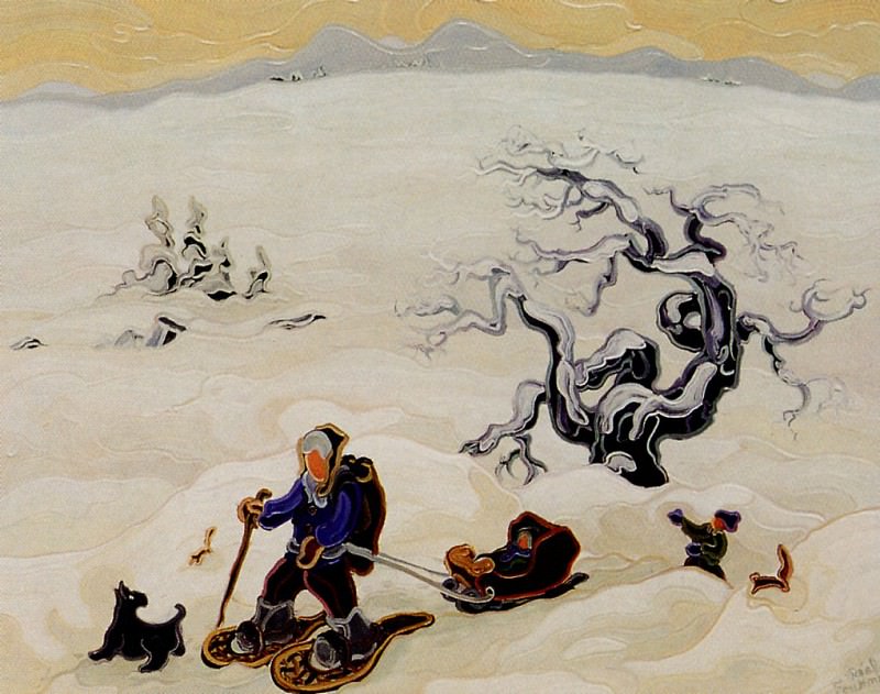 C'est peut-être peinture représentant un groupe de personnes jouant dans la neige devant une maison avec un arbre au premier plan et un ciel jaune en arrière-plan..