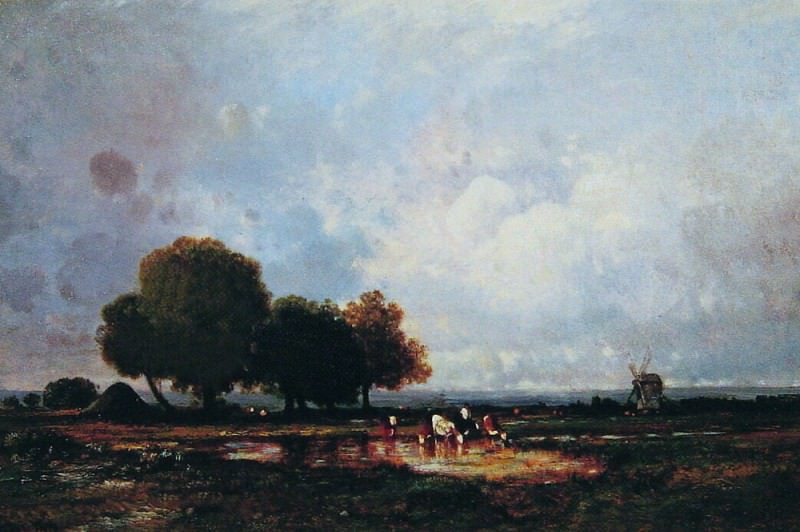 C'est peut-être une peinture d’un coucher de soleil avec du bétail paissant au premier plan et un plan d’eau.